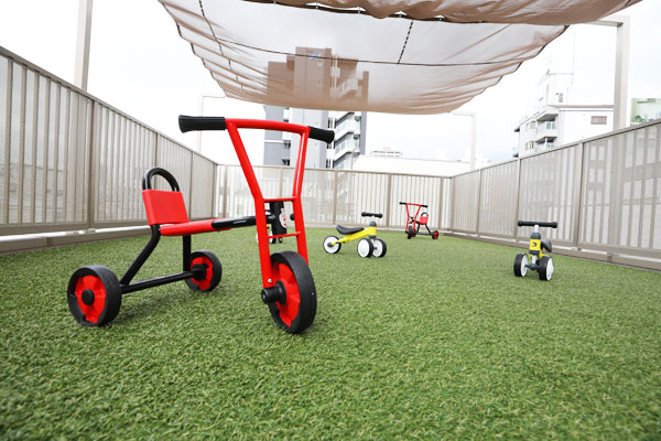 『 屋上園庭 』はみんなの広場屋上園庭は開放感あふれるみんなの広場。例えば、夏は水遊びや感触あそびを楽しんだり、天気の良い日には給食のお弁当を一緒に食べたり。四季折々の光や風を感じながら楽しい時間が過ごせます。 -